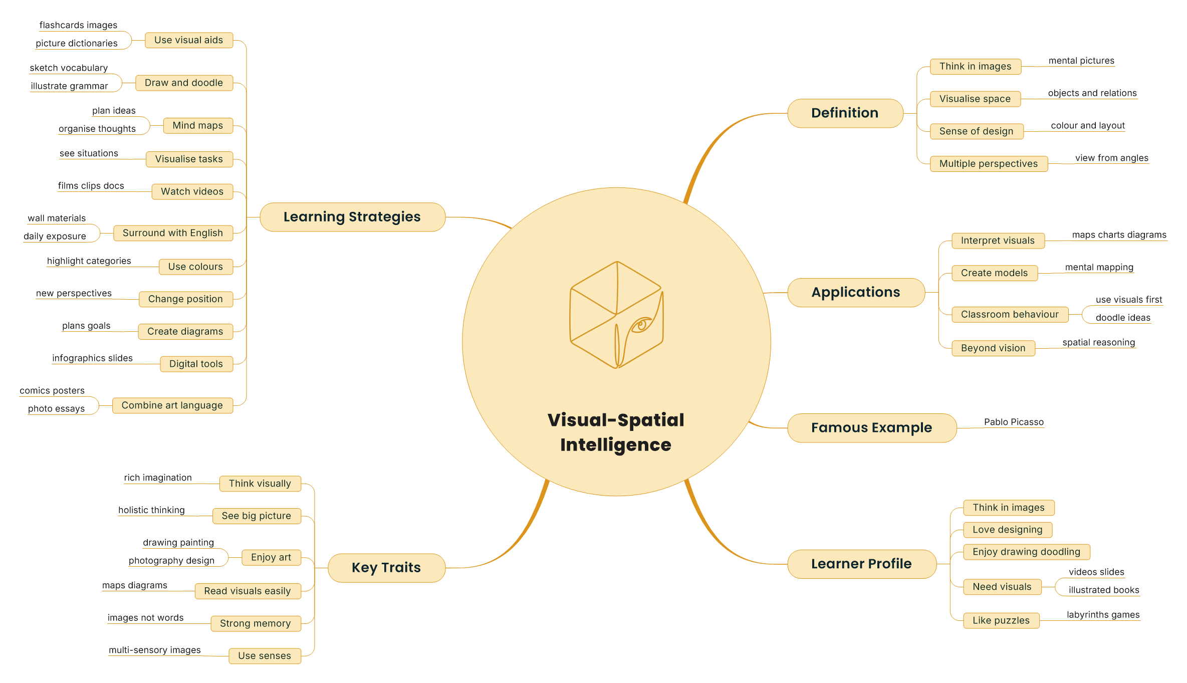 A person with strong visual-spatial intelligence thinks in images and creates rich mental representations of reality. They naturally use metaphors and have a strong sense of the whole — they see the big picture. They enjoy art in all its forms: drawing, painting, sculpture, and photography. They read maps, diagrams, and charts with ease and remember information as images rather than words. They have a good sense of colour and use all their senses when forming a mental picture of something.